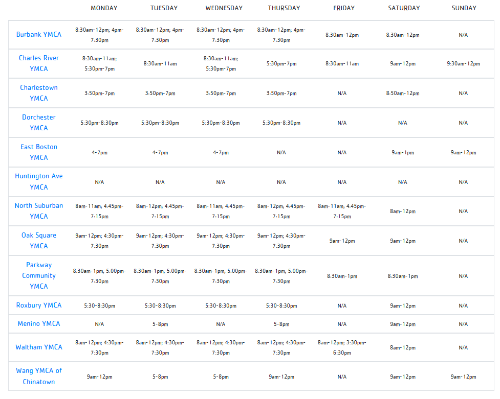 查看下面的时间表或联系基督教青年会中心,了解有关儿童看护服务的更多信息。